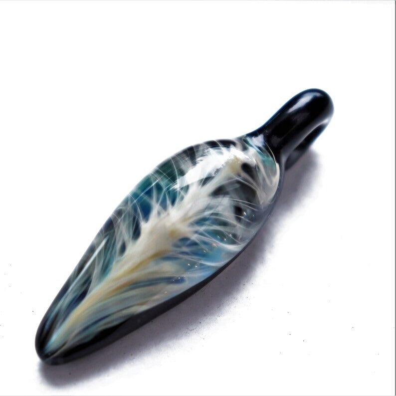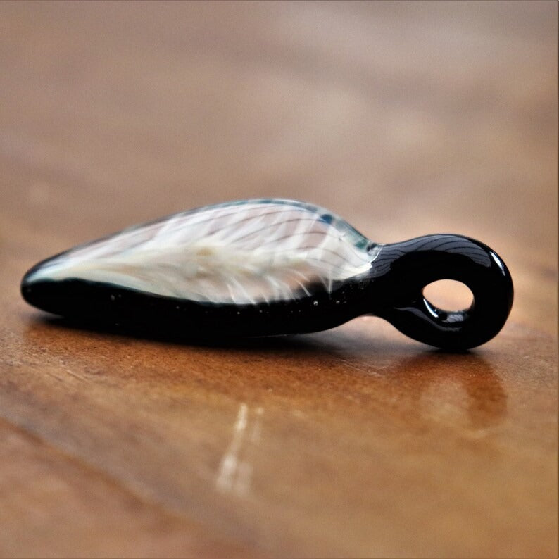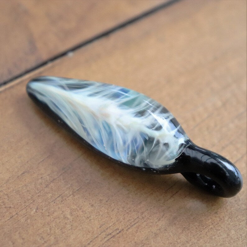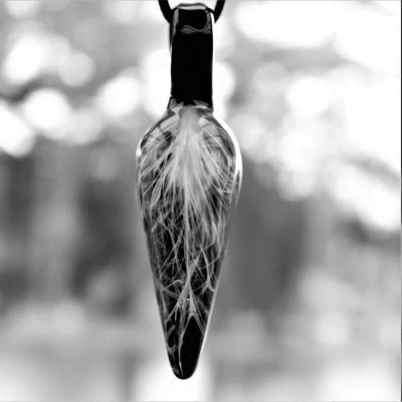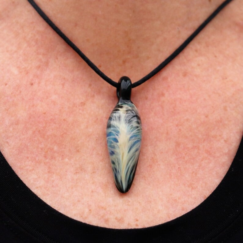 This uniquely handcrafted glass pendant is infused with pure silver that resembles a white feather. Every pendant is made from scratch which makes it exclusive. The pendant can be infused with a tiny amount of human or pet cremains. Included with the purchase is a faux leather cord to wear it close to your heart.