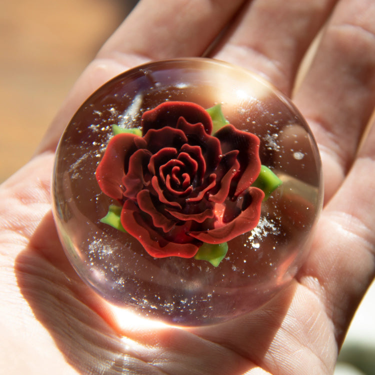 The clear glass globe is specially made by hand and features a stunning red rose. Memorialized the life of a lost pet, friend, or family member with this ash-infused paperweight keepsake. It is the perfect lightweight alternative for something other than an urn.