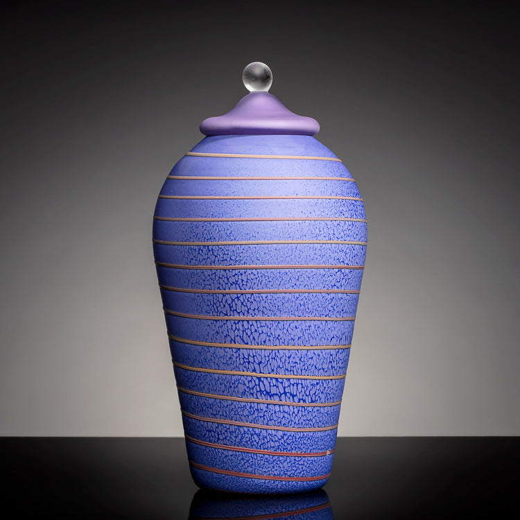 The Violet Swirl Blown Glass Urn is a testament to the exquisite craftsmanship of handblown glass, offering a serene and beautiful resting place for loved ones or a striking decorative piece for any setting.