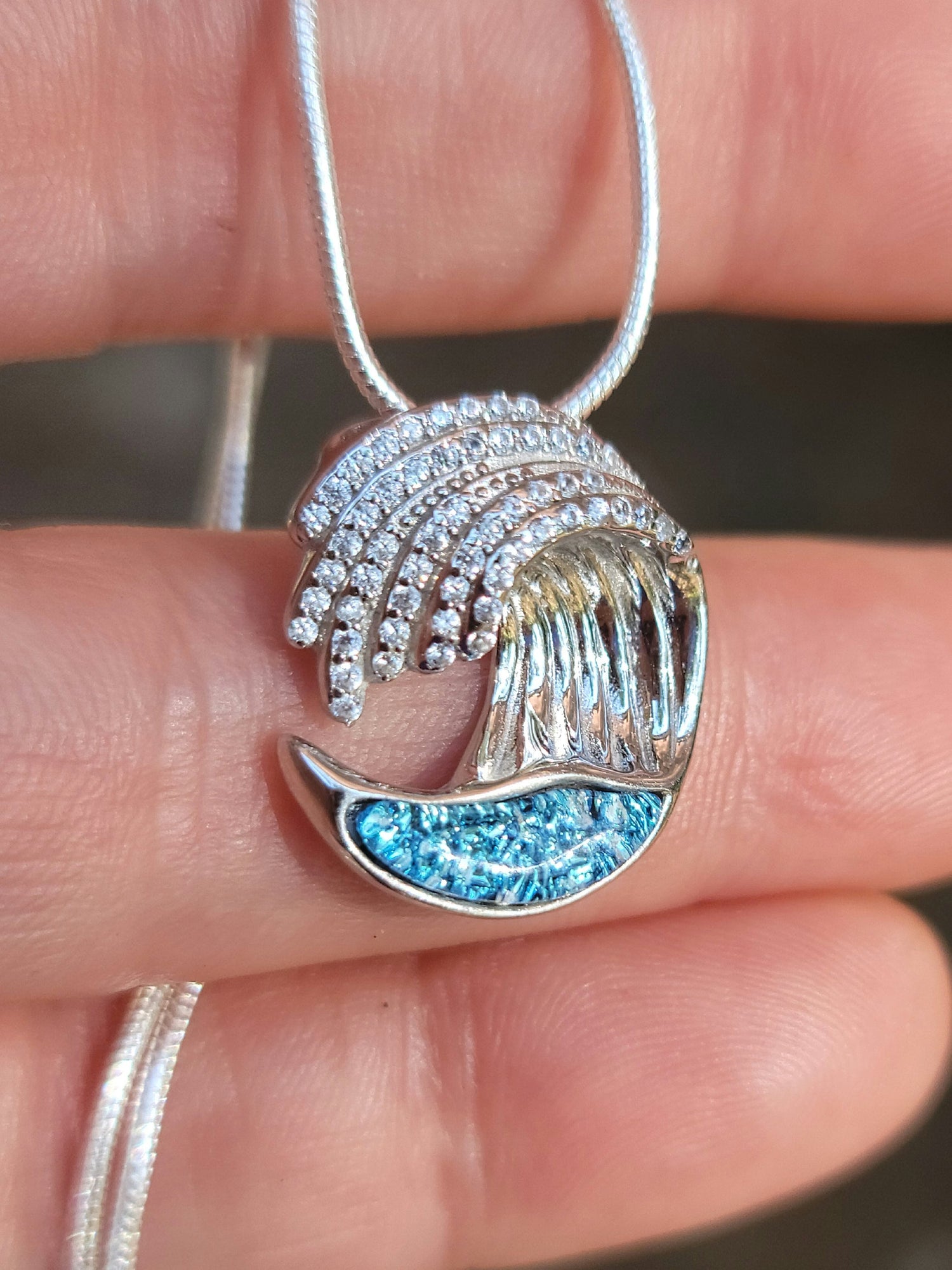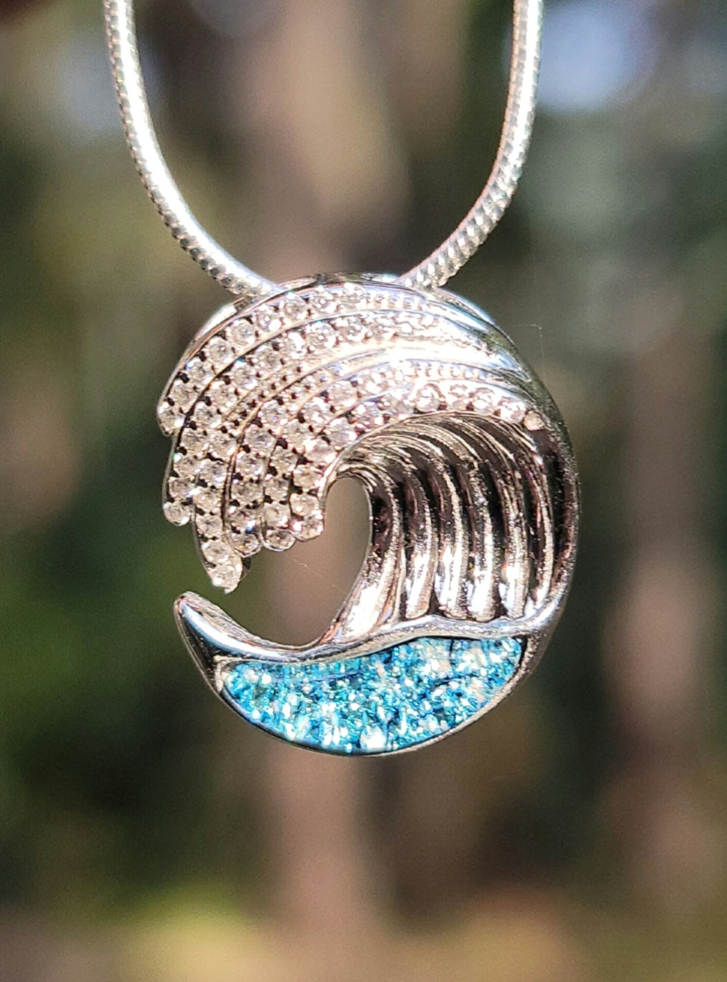 This ocean-inspired piece of memorial jewelry comes in a beautiful design of a wave and the sea, which symbolizes the ebbs and flows of life.